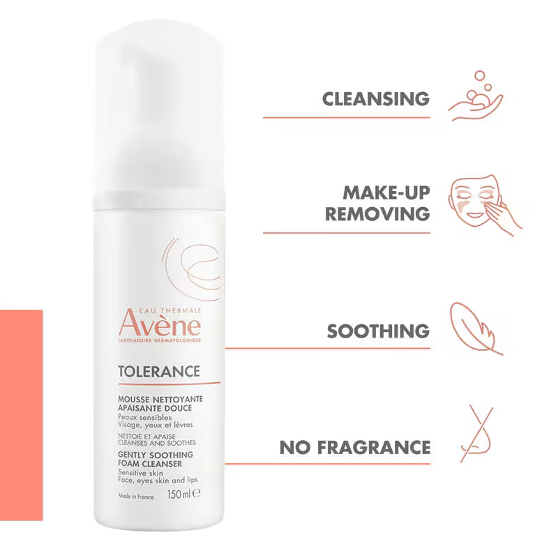 The Tolerance Gently soothing foam cleanser, an innovation where gentle care meets powerful results for those seeking comfort and calm for their sensitive and hypersensitive skin, formulated with 99% natural origin ingredient, this rinse-off formula enhanced with effective make-up removing properties offers immediate relief from tightness, dryness, and burning sensations, providing up to a 50% reduction in skin sensitivity after 28 days of regular use, fragrance-free, alcohol-free, this ultra-restoring and soothing cleanser features TRP-Regulin to reduce skin discomfort and block inflammation, alongside glycerin and thermal water to hydrate, restore, and reinforce the skin's microbiome, Enjoy the rich, airy foam with a creamy texture, delivered through an easy-dosed pump for a luxurious feel that leaves your skin soft and calm.