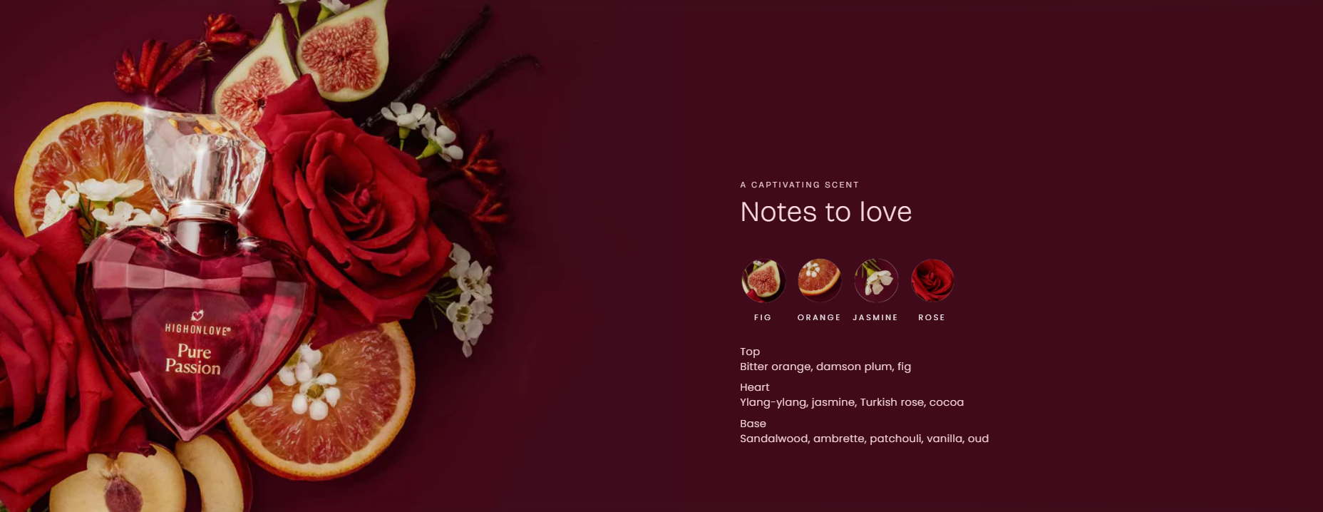 Introducing Pure Passion, a signature HighOnLove fragrance inspired by the modern woman. Crafted with clean ingredients, this indulgent blend opens with a burst of citrus and succulent fruits, while a heart of jasmine and rich cocoa wraps you in warmth.